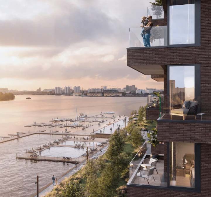 Архитектура вдохновлена водой и движением — это современный европейский подход к городскому жилью у реки.